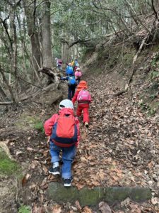 見事登りきった先では木漏れ日がキラキラとスポットライトの様に差し込み、紅潮したほっぺと白い息。みんなの誇らしげな顔。自分の足で登りきったからこそ味わえる充実感です。ご褒美のレーズンやきなこねじりも、しっかり味わいました。