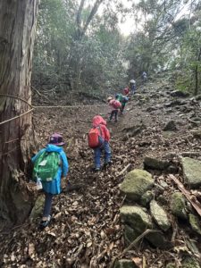 にじ・そら組には、ロープをつたって長い崖を登る難所が待ち受けるチャレンジコースを準備しました。