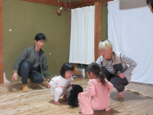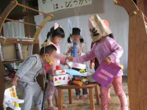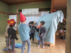 さすが!にじぐみさん!!セリフも展開もバッチリ覚えていて、Yくんは大道具の配置までこなしてしまう!!人前が苦手なMちゃんがしっかり役をこなす成長ぶりに、感動しました!最後は悪者まで仲間にしてしまい、みんなでお散歩♪4人の穏やかな関係性がにじみ出ているお話でした。
